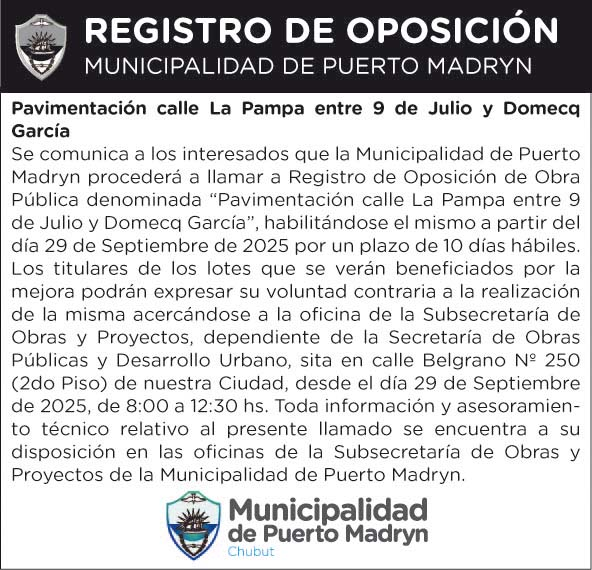Se comunica a los interesados que la Municipalidad de Puerto Madryn procederá a llamar a Registro de Oposición de Obra Pública denominada “Pavimentación calle La Pampa entre 9 de Julio y Domecq García”, habilitándose el mismo a partir del día 29 de Septiembre de 2025 por un plazo de 10 días hábiles. Los titulares de los lotes que se verán beneficiados por la mejora podrán expresar su voluntad contraria a la realización de la misma acercándose a la oficina de la Subsecretaría de Obras y Proyectos, dependiente de la Secretaría de Obras Públicas y Desarrollo Urbano, sita en calle Belgrano Nº 250 (2do Piso) de nuestra Ciudad, desde el día 29 de Septiembre de 2025, de 8:00 a 12:30 hs. Toda información y asesoramiento técnico relativo al presente llamado se encuentra a su disposición en las oficinas de la Subsecretaría de Obras y Proyectos de la Municipalidad de Puerto Madryn.